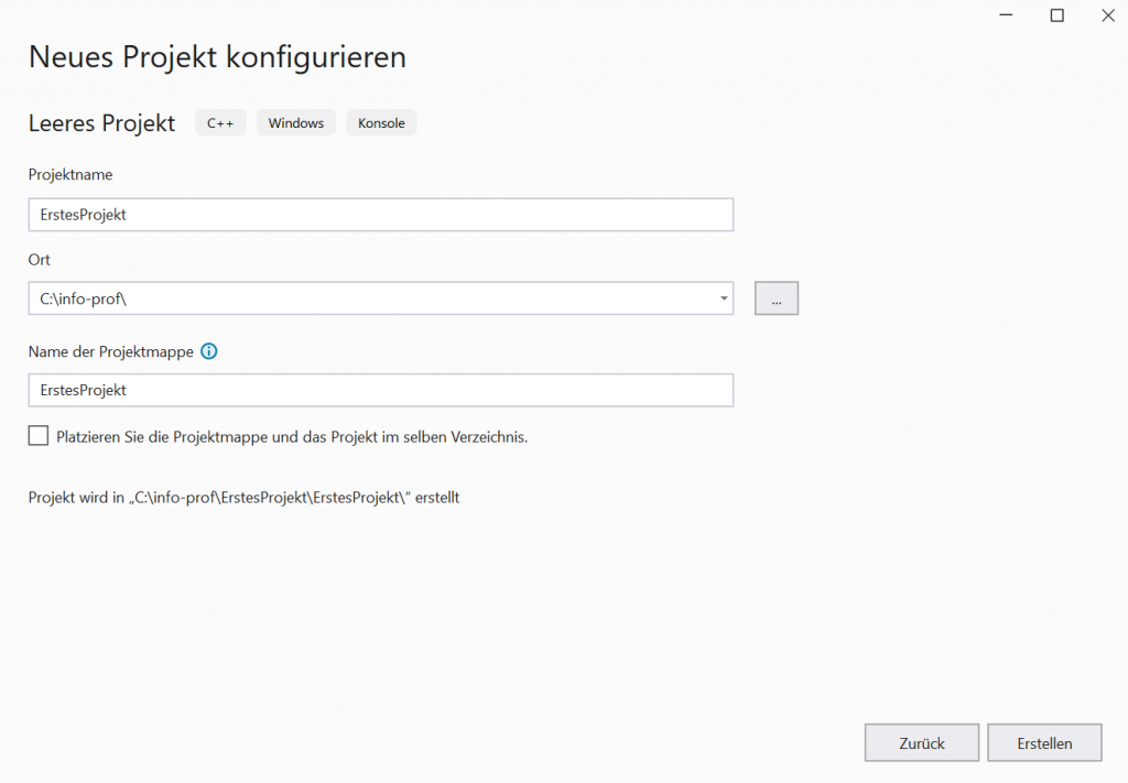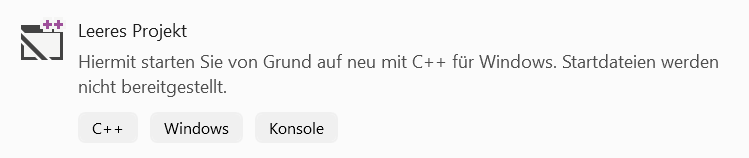 Danach musst Du noch den Projekttyp und die Sprache auswählen. Da klickst Du auf das leere Projekt mit der Programmiersprache C++. Nicht wundern, ja hier wählen wir C++, weil das sehr ähnlich zu C ist.