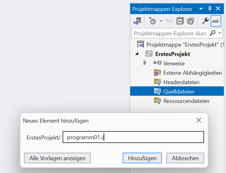 Wenn Du damit durch bist, siehst Du erstmal eine leere IDE. Nur rechts wird der Projektmappen-Explorer angezeigt. Jetzt noch schnell eine erste Datei anlegen. Dazu klickst Du mit rechten Maustaste auf Quelldateien und dann Hinzufügen -> Neues Element. In dem Eingabefenster für den Datei gibst Du programm01.c ein, also so: