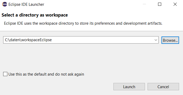 Um Eclipse zu starten, wird die Datei „eclipse.exe“ im eclipse-Ordner aufgerufen. Beim Starten muss nun zunächst der Arbeitsbereich „Workspace“ festgelegt werden.