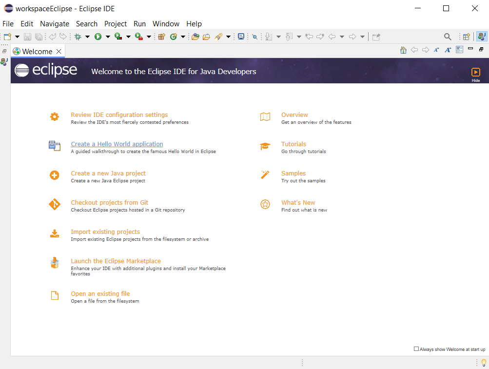 Falls Sie Eclipse vorhin zum ersten Mal gestartet haben, sehen Sie nun wieder den Begrüßungsbildschirm.