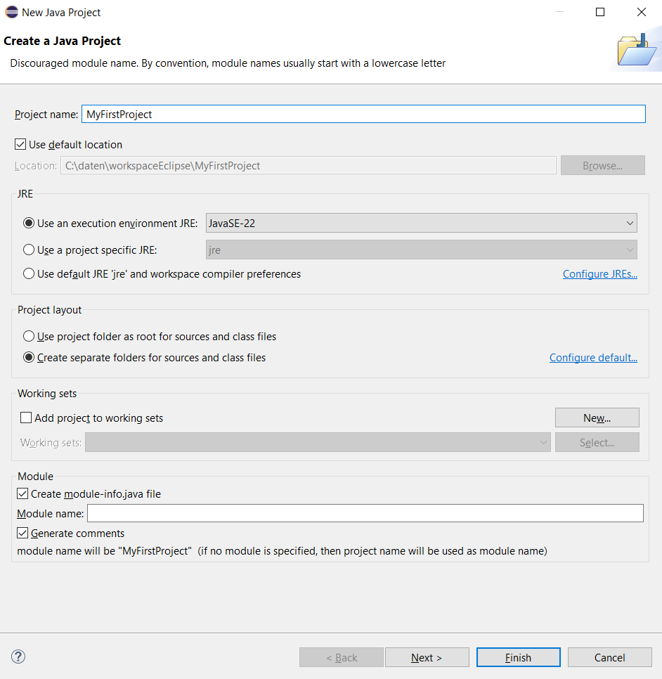 Als nächstes erstellen wir nun ein Java-Projekt. Dazu wählen wir in der Menüleiste den Eintrag „File“ aus. In dem aufklappenden Menü selektieren wir den Eintrag „New“ und anschließend „Java Project“. Der Java Projekt Assistent wird nun gestartet. Hier geben wir in das oberen Feld „Project name“ unseren Projektnamen ein. Wir nennen es hier „MyFirstProject“.