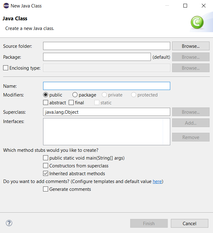 Damit wir ein lauffähiges Programm erhalten, brauchen wir einen Startpunkt, der sich in Java immer in der main-Methode befindet. Daher setzen wir ein zusätzliches Häkchen bei dem Eintrag public static void main(String[] args). Anschließend können wir wieder die Schaltfläche „Finish“ betätigen. Jetzt haben wir es geschafft unser erstes Projekt, inklusive einer Java-Startklasse, in der Java-Entwicklungsumgebung Eclipse aufzusetzen.