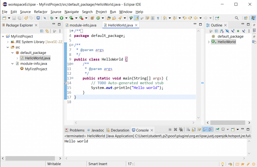Im unteren Bereich von Eclipse sollten Sie wie im Screenshot ein kleines Fenster sehen, in dem unsere Ausgabe „Hello World!“ angezeigt wird: